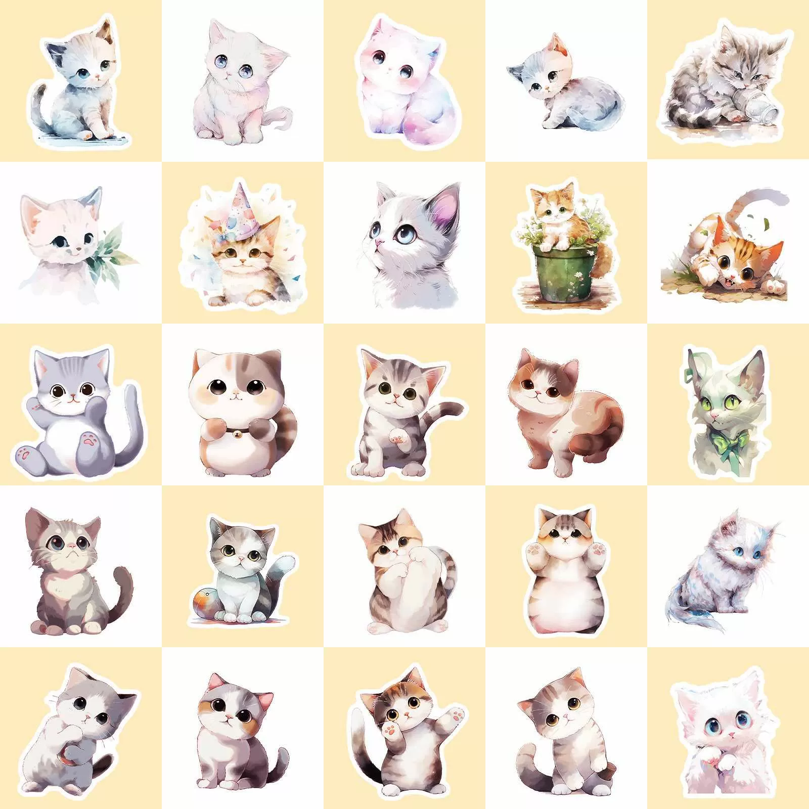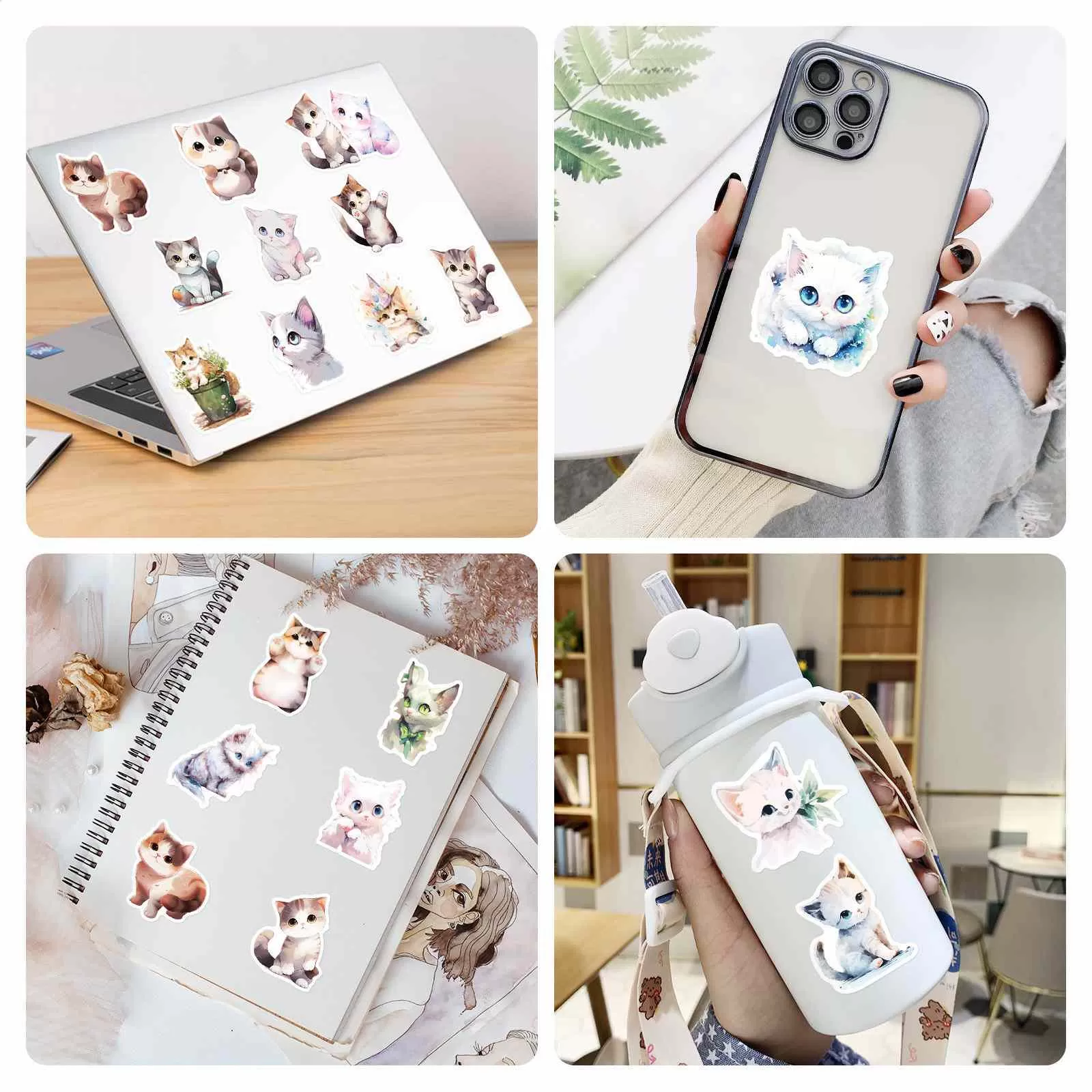 JIELEN 50 CÁI Hình dán mèo con màu nước Bonsai, Đề can vẽ nguệch ngoạc mèo hoạt hình dễ thương cho chai nước, máy tính xách tay, Sổ lưu niệm tự làm, Vỏ điện thoại, Nghệ thuật treo tường, Trang trí nội thất