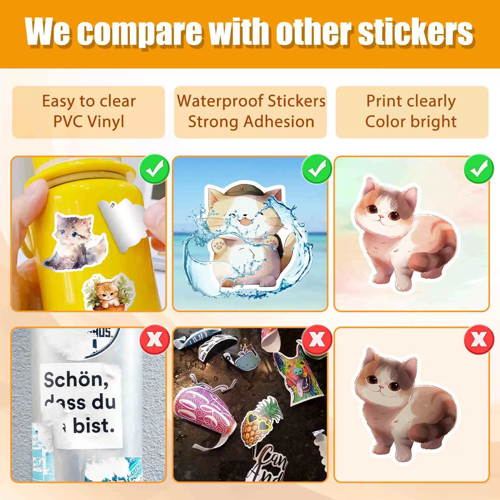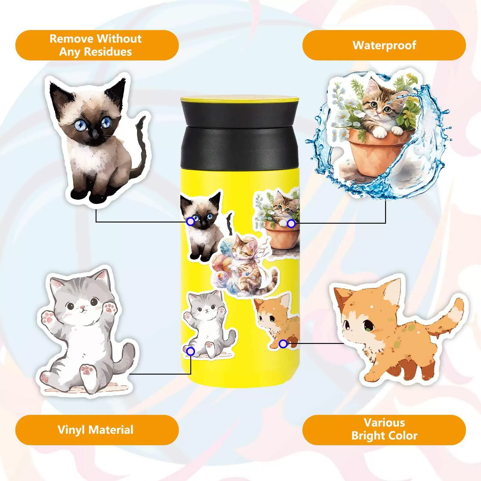 Thiết kế phong phú & Chất liệu cao cấp: Có 50 hình dán mèo con dễ thương độc đáo theo phong cách màu nước và cây cảnh quyến rũ. Được làm từ màng PVC bền, không thấm nước, những đề can này có khả năng chống xước và không bị phai màu, đảm bảo sự sống động lâu dài trên đồ đạc của bạn.