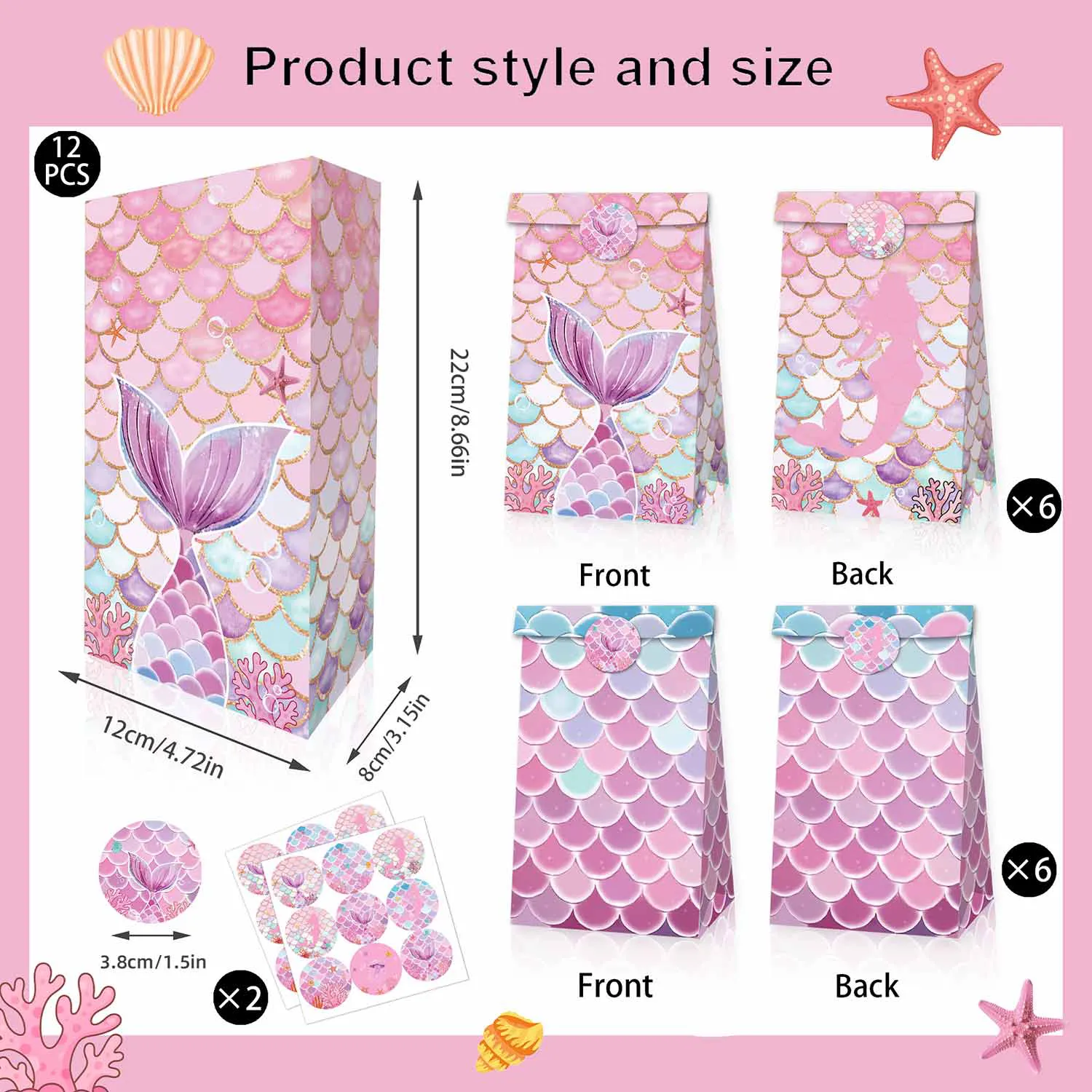 Kích thước bộ: Những túi kẹo nàng tiên cá này có kích thước 8,7 x 4,7 x 3,1 inch, Cung cấp đủ không gian để lưu trữ các vật dụng nhỏ khác nhau.