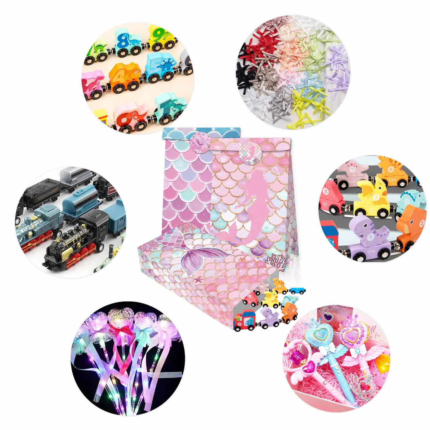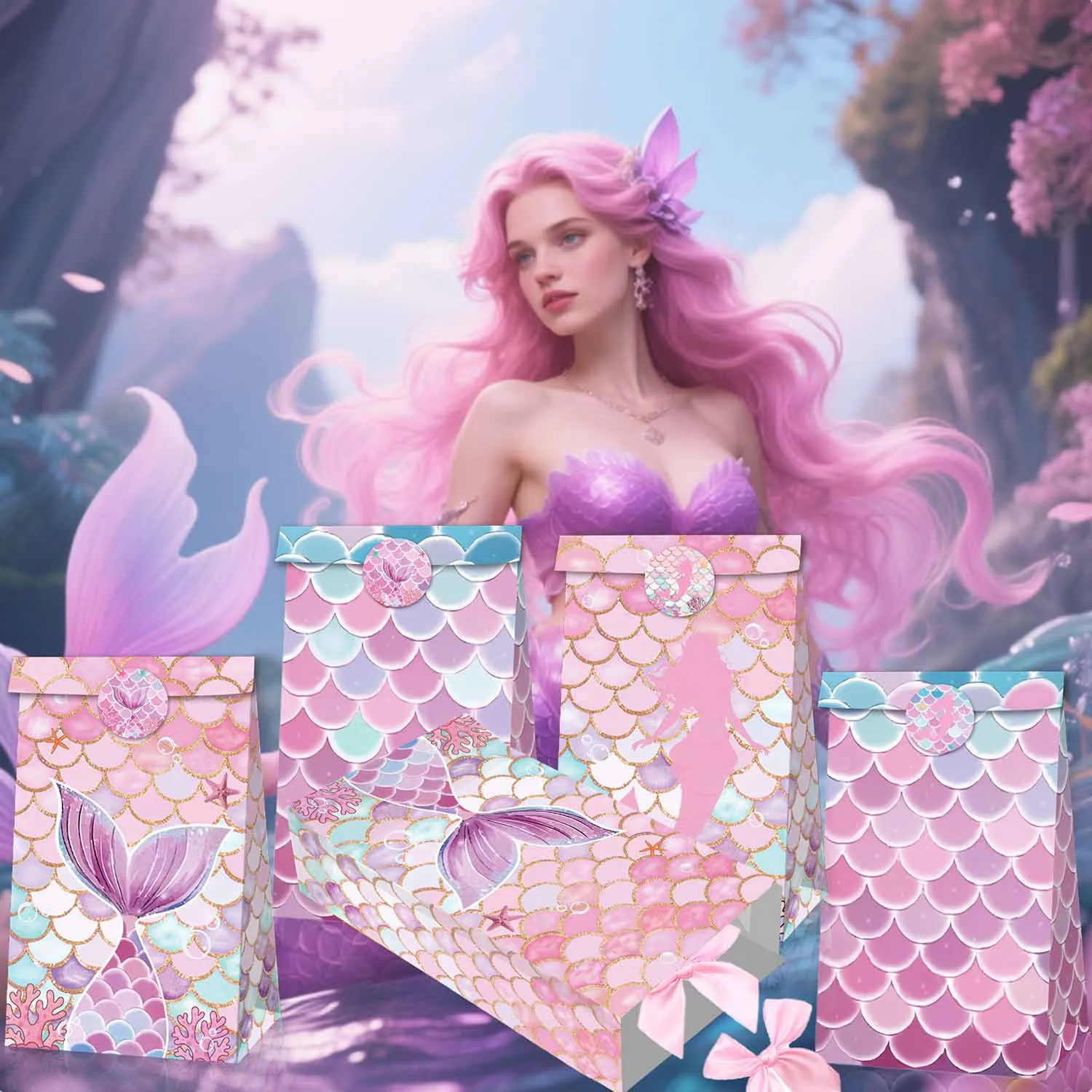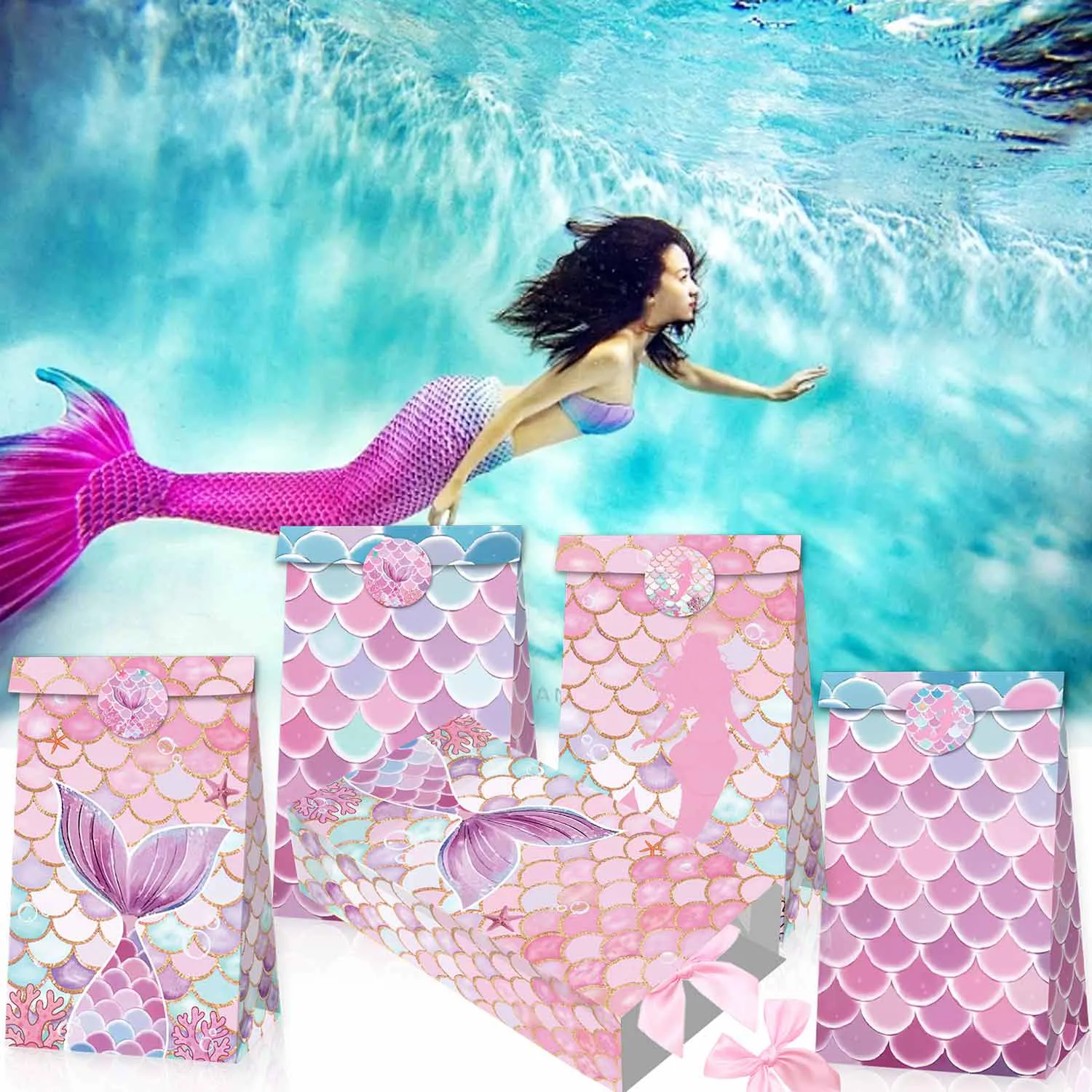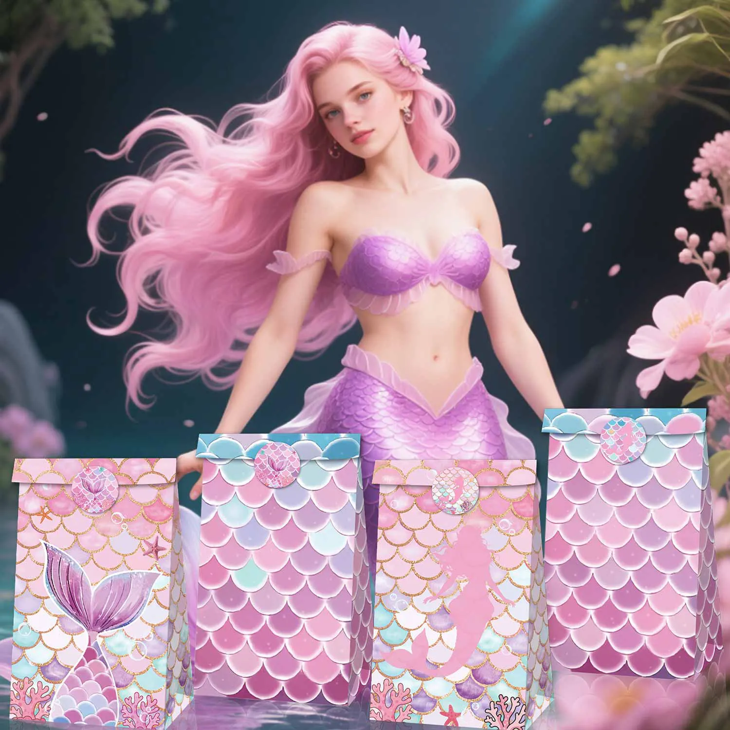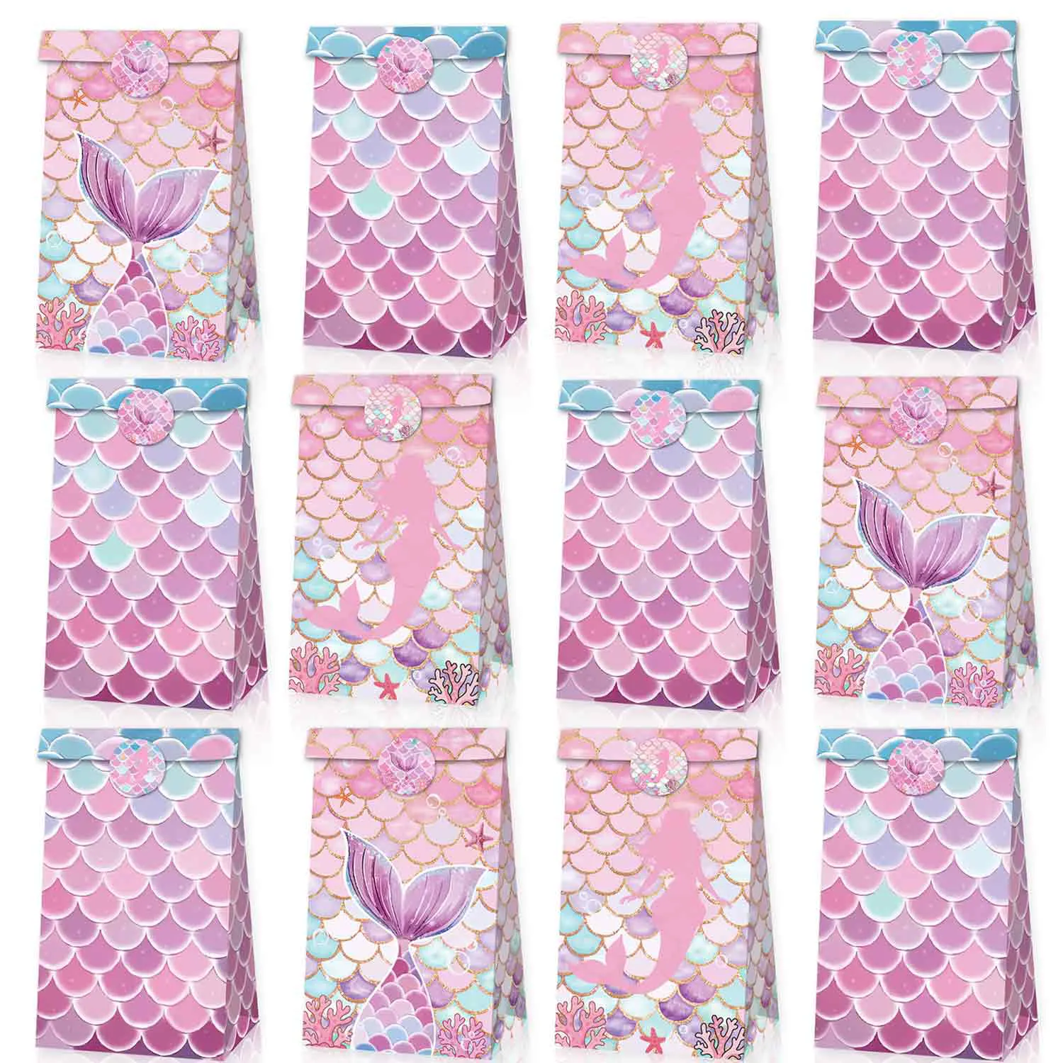 Túi quà nàng tiên cá: Gói bao gồm 12 túi quà dự tiệc được thiết kế với vảy đuôi nàng tiên cá, có 4 kiểu khác nhau và đi kèm với 18 nhãn dán, Những túi quà này rất thích hợp cho các dịp hoạt động khác nhau của phụ nữ.